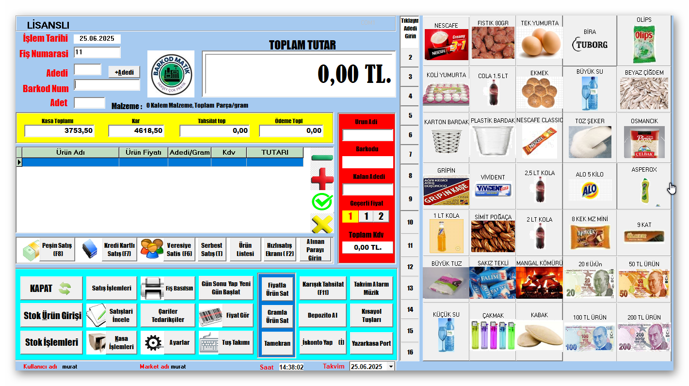 5000 den fazla ürün girilmiş durumda fiyatları güncelleyip Barkod okuyucunuz ile barkodmatik Hızlı Satış Programında Barkodlu Satış yapmaya başlayabilirsiniz, Dokunmatik ekranlar ile uyumlu çalışabilecek şekilde tasarlanan arayüzümüz sayesinde, dokunmatik ekranlı bilgisayarlarınızda da rahatlıkla kullanabilirsiniz. Büyük Marketler, işini büyütmek isteyen Mini Marketler, Perakende satış yapan tüm İşletmelerin kullanabileceği tüm perakende sektörüne hitap edeb Hızlı Satış Programı ile Peşin Satış yapabileceğiniz gibi Cari Borçlandırma yöntemi ile ( Açık Hesap ) de satış yapabilirsiniz...